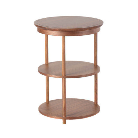 Приставной столик в классическом английском стиле прекрасно впишется в интерьер нейтральных тёплых оттенков благодаря приятному золотисто-бежевому цвету древесины, из которой он выполнен. Несмотря на небольшие размеры, он весьма функционален, так как имеет две открытые полки, идентичные круглой столешнице. Модель выглядит сдержанно и элегантно