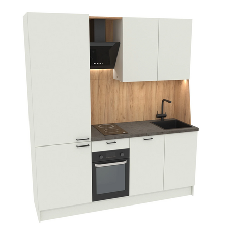 Модель подразумевает узкий духовой шкаф шириной 450 мм, варочную – домино, вытяжку шириной 450 мм, встроенный холодильник, без ниши для СВЧ. В комплекте петли Blum встроенного холодильника!