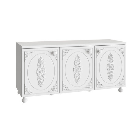 Тумба под ТВ Ассоль АС-55 оснащена тремя тумбами с полками внутри. Такую модель можно использовать как тумбу под телевизор, так и просто как тумбу для различных вещей. Объемный рисунок на дверцах, делают тумбу еще более элегантной. Дверцы - универсальные, направление открытия меняется. Фурнитура: петли с доводчиками. Высота опоры 65 мм. Мебель изготовлена из качественной ламинированной ДСП 16 мм. В оформлении фасадов МДФ применяется уникальная технология нанесения объемного узора 3D.